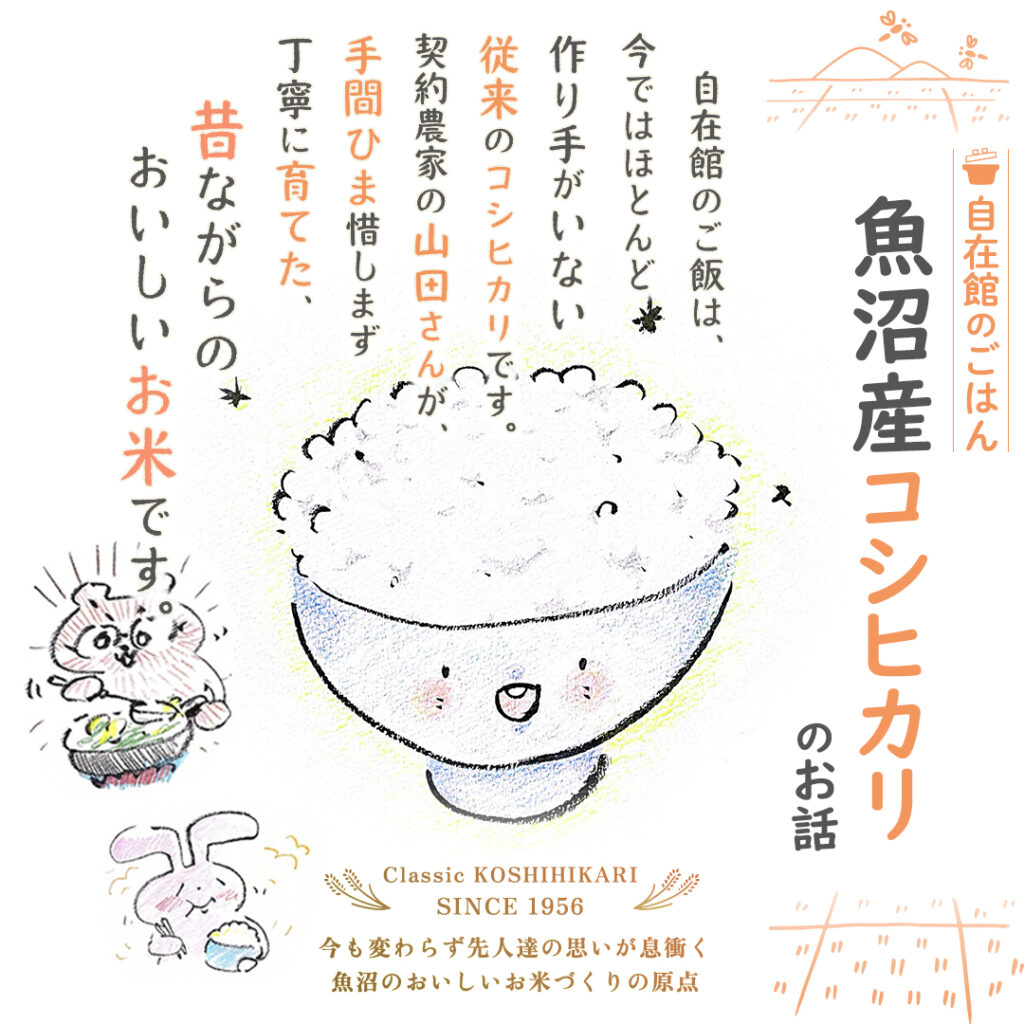 地元の、顔も、人柄も知っている、自分たちの好きなお米をお客様にお届けしたく、宿から車で10分程の田んぼで、コツコツと昔ながらの魚沼産コシヒカリ(従来品種)栽培に取り組む、ご近所の農家さんから直接買い付けて、直接届けていただいています。