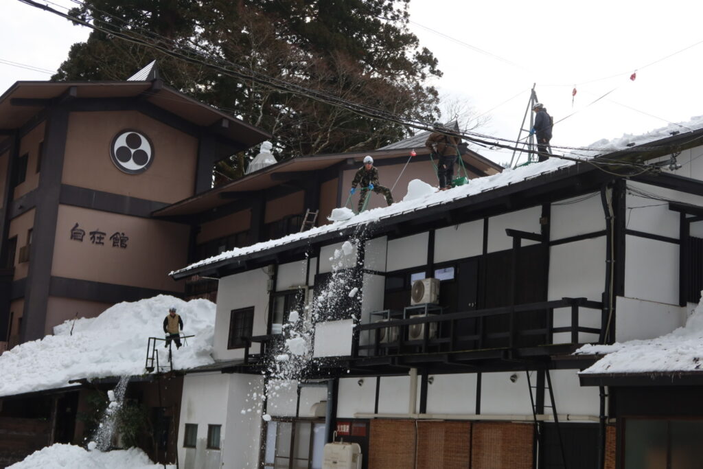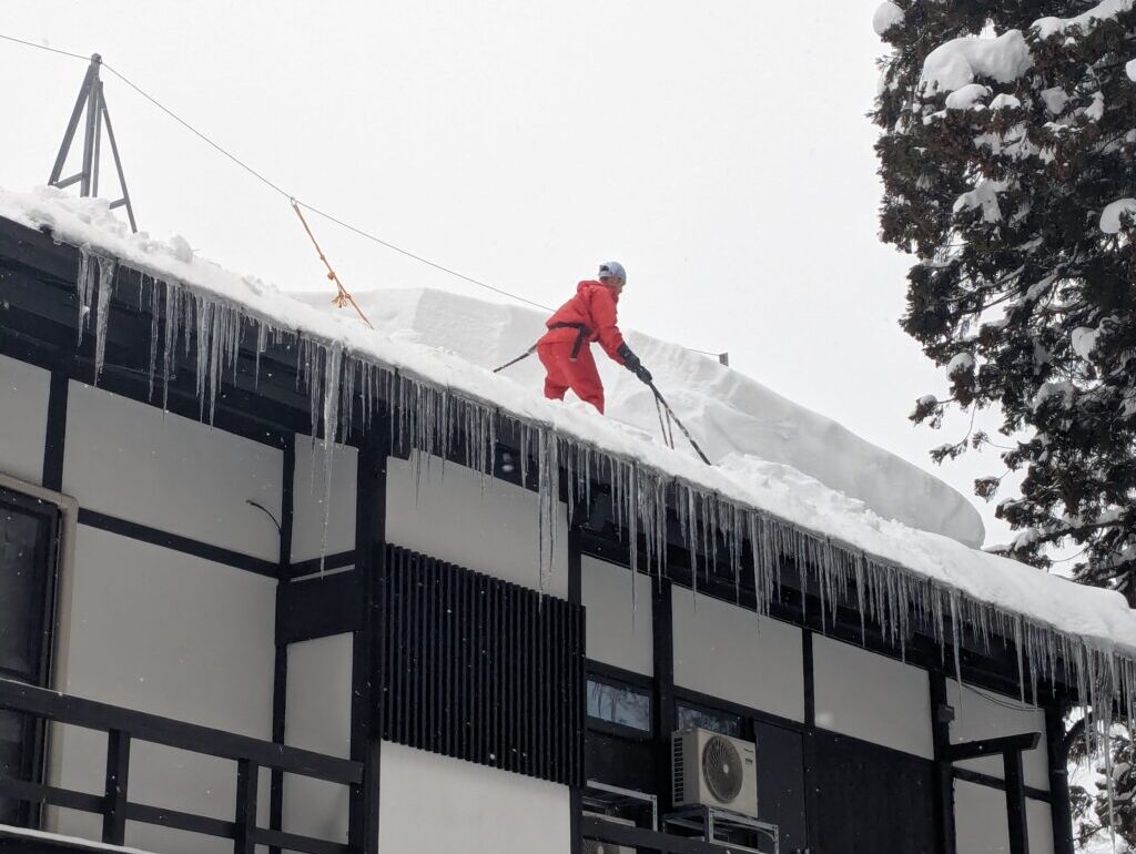 疲れた腕でスノーダンプを持っていかれ、屋根下へ、そして崖へ真っ逆さま……。