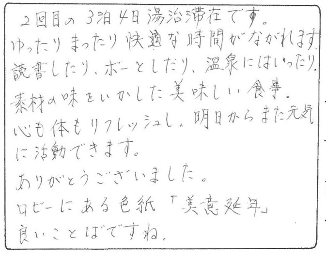 お客様の声・レビュー·2025年11月26日·1 min read2回目の3泊4日湯治滞在です。No.2058 2回目の3泊4日の湯治滞在です。 ゆったりまったり快適な時間がながれます。読書したり、ボーっとしたり、温泉にはいったり、素材の味をいかした美味しい食事。心も体もリフレッシュし、明日からまた元気に活動できます。ありがとうございました。 ロビーにある色紙「美意延年」良いことばですね。photo by 栃尾又ラジウム温泉 自在館