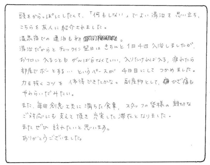 頭をからっぽにしたくて、「何もしない」でよい湯治を思い立ち、こちらを友人に紹介されました。温泉宿での連泊も初。 湯治だからとチェックイン翌日はきちんと1日4回入浴しましたが、おフロに入ることもがんばらなくていい、入りたければ入る、疲れたら部屋でボーとする…というペースが4日目にしてつかめました。力を抜くコツを体得できたかな。副産物として、ひざ痛もやわらいだみたい。また、毎回創意工夫に満ちた食事、スタッフの皆様の親切なご対応にも支えて頂き充実した滞在となりました。またぜひ訪れたいとおもいます。ありがとうございました。photo by 栃尾又ラジウム温泉 自在館