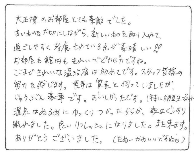 大正棟のお部屋とても素適でした。古いものを大切にしながら、新しいものを取り入れて、過ごしやすく考慮されている点が素晴らしい!!お部屋も館内もきれいでピカピカですね。ここまできれいな湯治宿は初めてです。スタッフの皆様の努力を感じます。食事は質素と伺っていましたが、じゅうぶん豪華です。おいしかったです。(特に納豆、ヨーグルト)温泉はぬるめにつかったからか、夜はぐっすり眠れました。良いリフレッシュになりました。また来ます。ありがとうございました。(たぬーかわいいですね。) photo by 栃尾又ラジウム温泉 自在館