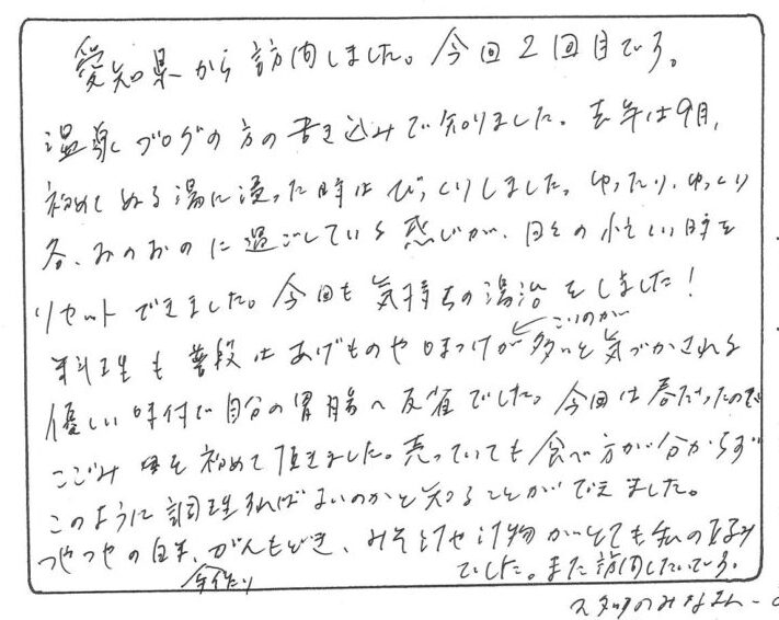 愛知県から訪問しました。今回2回目です。温泉ブログの方の書き込みで知りました。去年は9月、初めてぬる湯に浸かった時はびっくりしました。ゆったり、ゆっくり各、おのおのに過ごしている感じが、日々の忙しい時をリセットできました。今回も気持ちの湯治をしました!料理も普段はあげものや味つけがこいのが多いと気づかされる優しい味付で自分の胃腸への反省でした。今回は春だったのでこごみを始めて頂きました。売っていても食べ方が分からずこのように調理すればよいのかと知ることができました。つやつやの白米、手作りがんもどき、みそ汁や汁物がとても私の好みでした。また訪問したいです。スタッフのみなさん、ありがとうございました。photo by 栃尾又ラジウム温泉 自在館