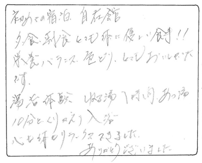 お客様の声・レビュー·2026年4月14日·1 min read心も体もリラックスできました。NO.2079 初めての宿泊、自在館。夕食、朝食とても体に優しい食事!!栄養バランス、色どり、とてもおいしかったです。湯治体験、ぬる湯1時間、あつ湯10分とくりかえり入浴。心も体もリラックスできました。ありがとうございました photo by 栃尾又ラジウム温泉 自在館